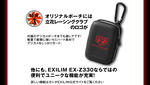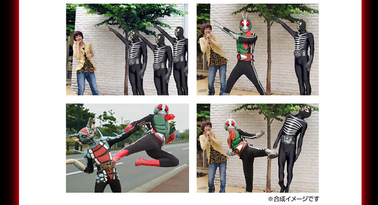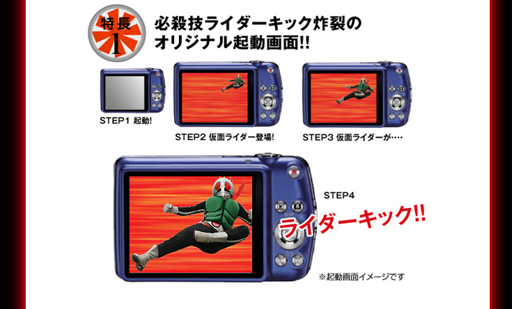 「仮面ライダー×EXILIM」モデルは、EXILIMで好評の動画合成が可能なダイナミックフォト機能を活用することで、 仮面ライダーやショッカーなどの仮面ライダー・キャラクター(10素材)と、撮影した静止画を合成し、憧れのキャラクターと一緒に写った、オリジナル写真が簡単に作成することができます。 起動画面に『仮面ライダー』のオリジナル画像が表示されるなど特別仕様のデジタルカメラ 「仮面ライダー×EXILIM」が500台の数量限定で登場いたします。EXILIM本体には、仮面ライダーとバイクをデザインしたクールな仕様。 オリジナルポーチには立花レーシングクラブのマークをデザイン。