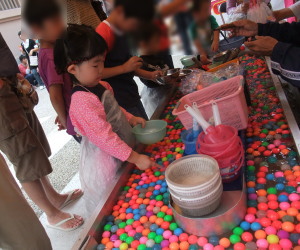 祭りで、このチビッコ専門ボールすくいのおじちゃんの店をいつも見かけます。